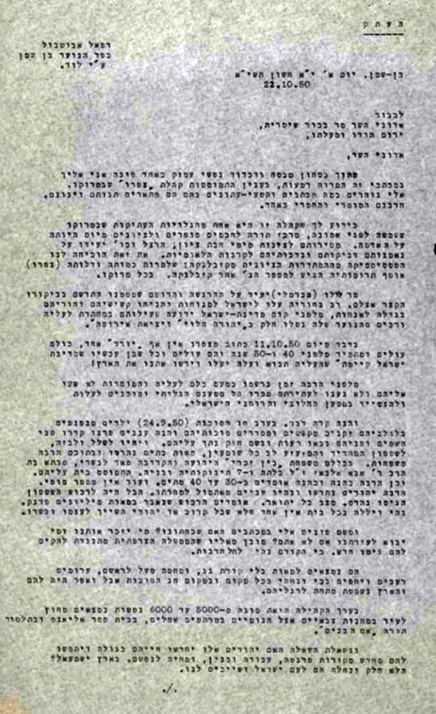 "מכתב משנת ה'תשי"א, 1950, שכתב רפי אביטל, לשר המשטרה דאז, בכור שטרית, בפנייה חשובה, מיום י"א במרחשוון התשי"א, בעניין הבא: