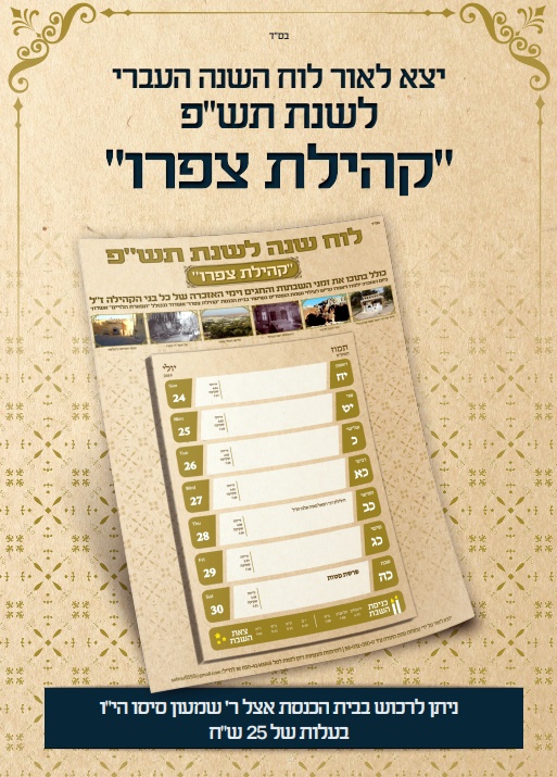 בס"ד בני קהילת צפרו היקרים בארץ ובעולם , שמחים אנו להודיע כי לוח השנה העברי המהודר ביופיו ל "קהילת צפרו" שנת תשפ"ב יצא לאור. החלוקה מתקיימת בבית כנסת לקהילת צפרו באשדוד מדי יום , א' עד ה' , בין השעות... להמשיך לקרוא →